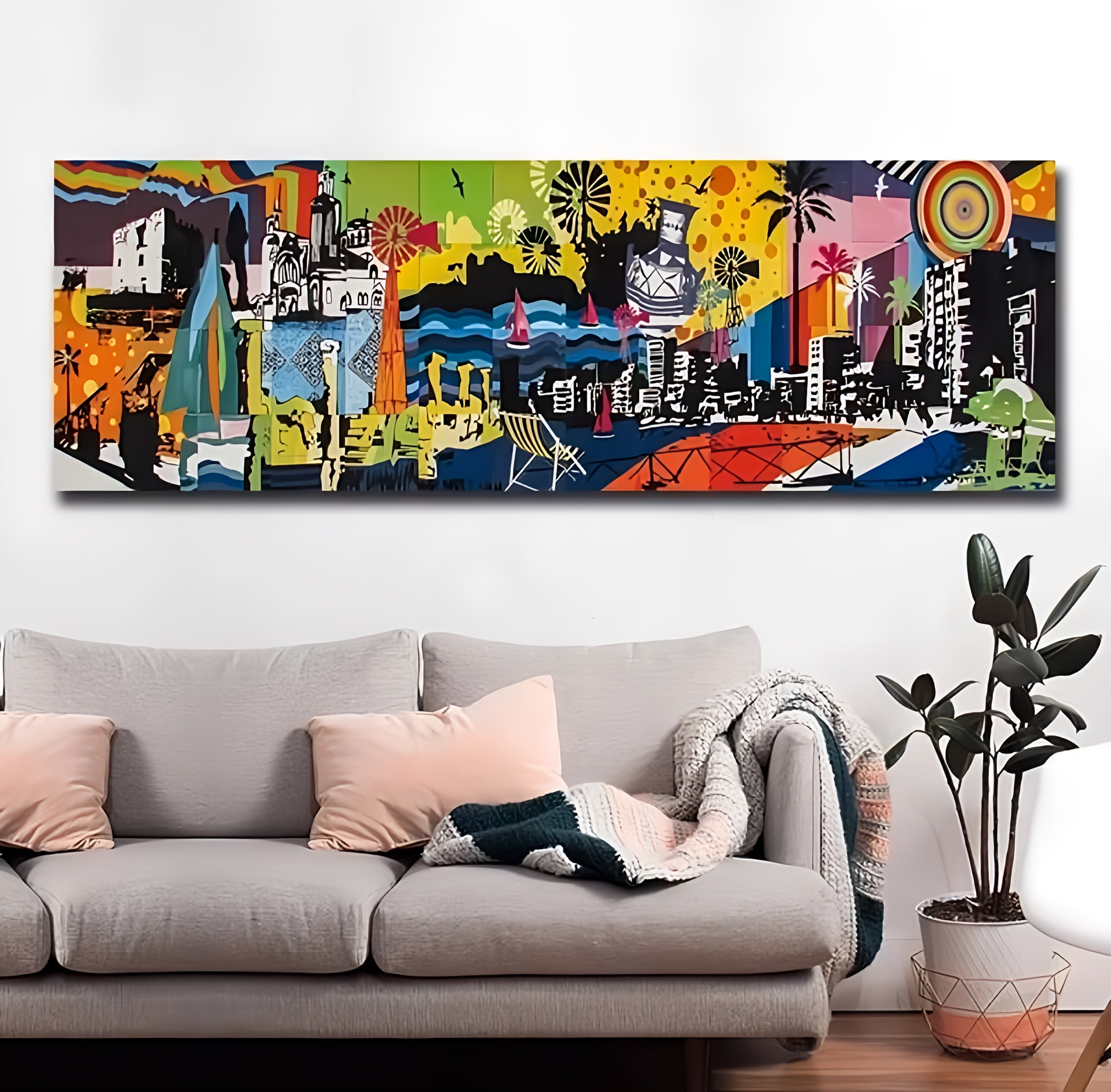 Abstract city landscape. wall art canvas painting. modern pop wall graffiti.