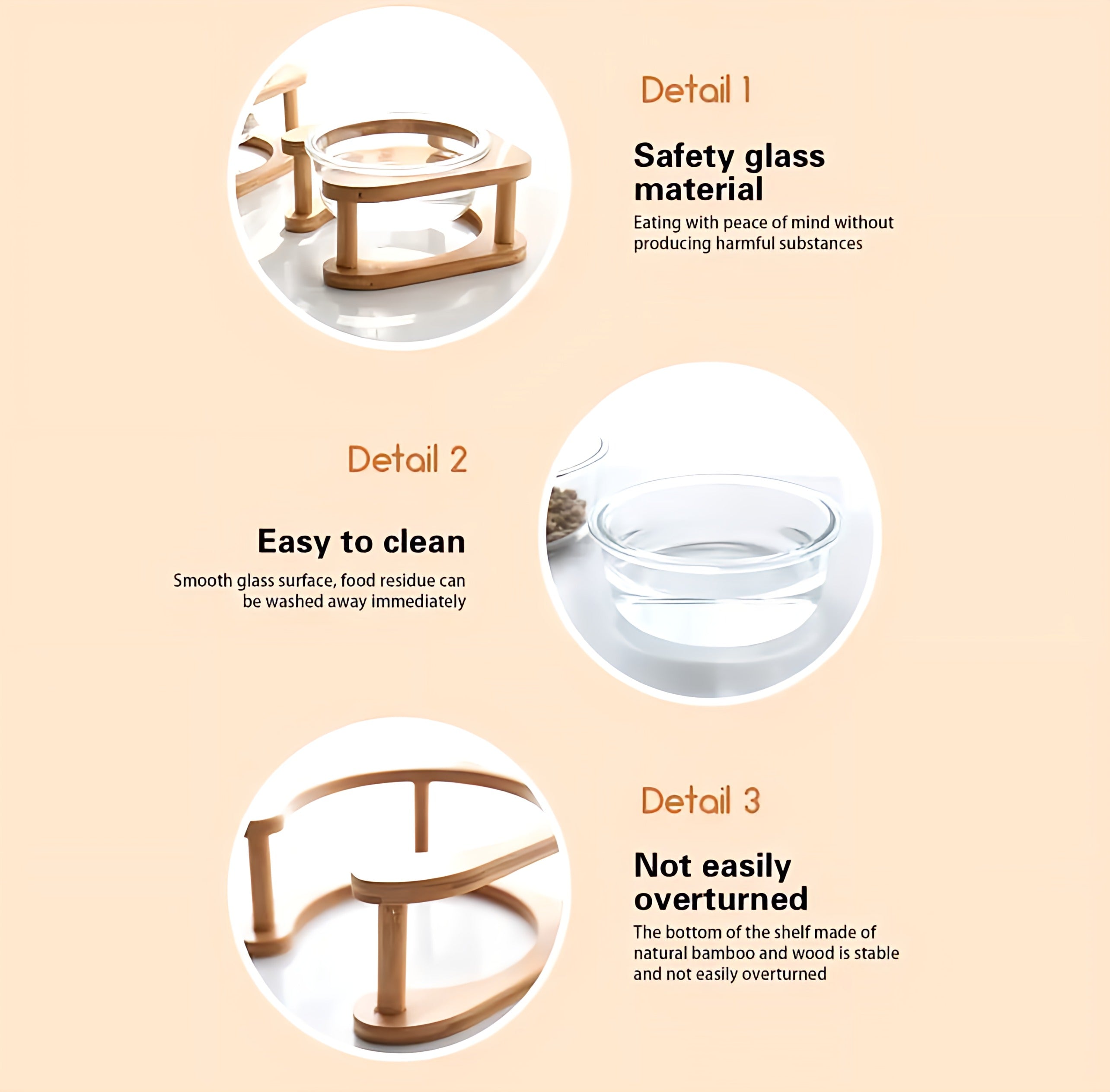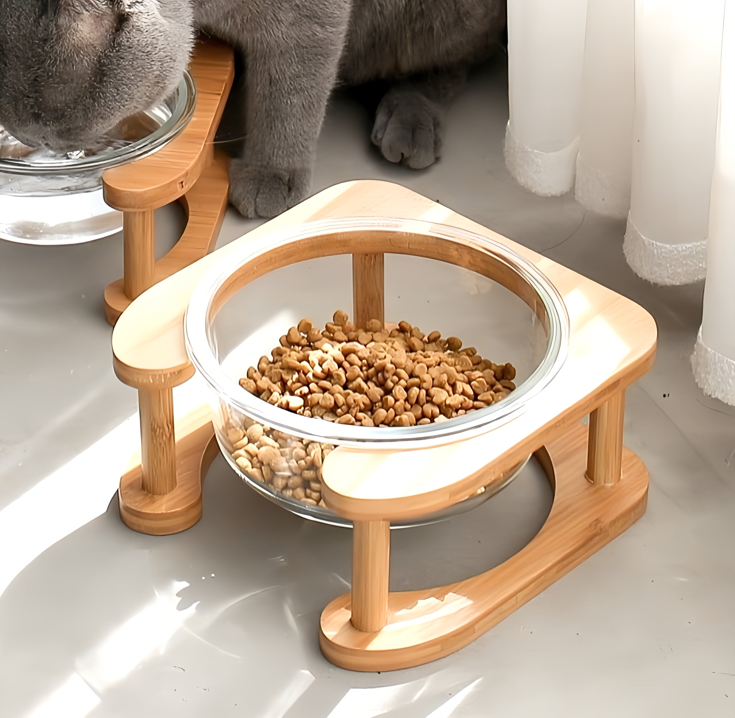 Bowl made of glass with a bamboo stand for meals.